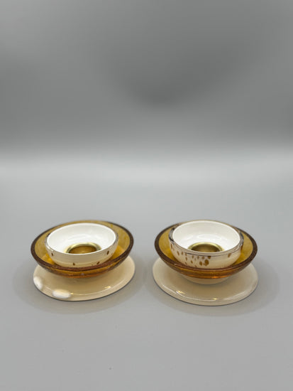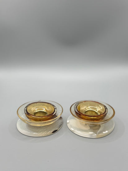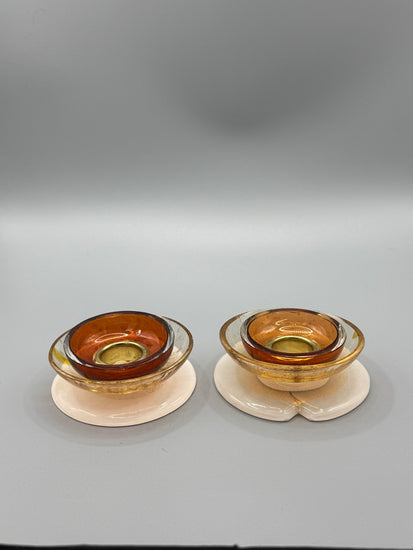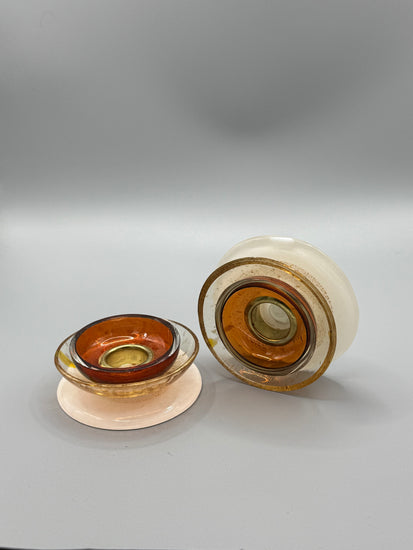 These candlestick holders are created using 100% recycled glass from the tops of the cups of each glass made. The process of glass making leads to waste often times and we wanted to create a product that utilizes these "cut offs". Each set it unique as they are created from a library of glass pieces based off of color arrangements. All pieces include gold leaf, cut and polished tiers of glass, and brass ferrels.